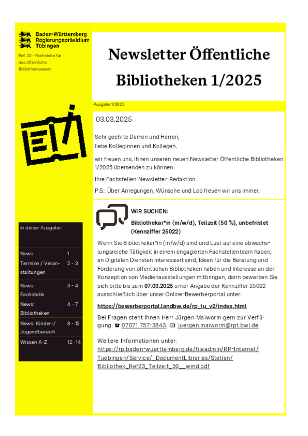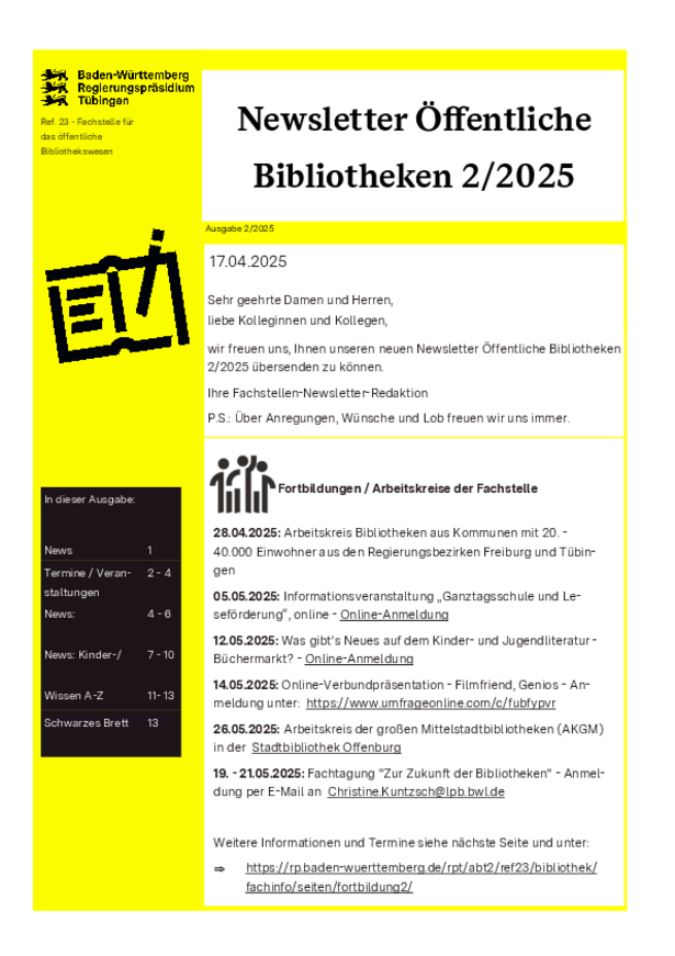 Herausgegeben von dem Landesverband Baden-Württemberg im Deutschen Bibliotheksverband e.V., den Fachstellen für das öffentliche Bibliothekswesen bei den Regierungspräsidien in Freiburg, Karlsruhe, Stuttgart und Tübingen und dem Berufsverband Information Bibliothek e.V., Landesgruppe Baden-Württemberg.