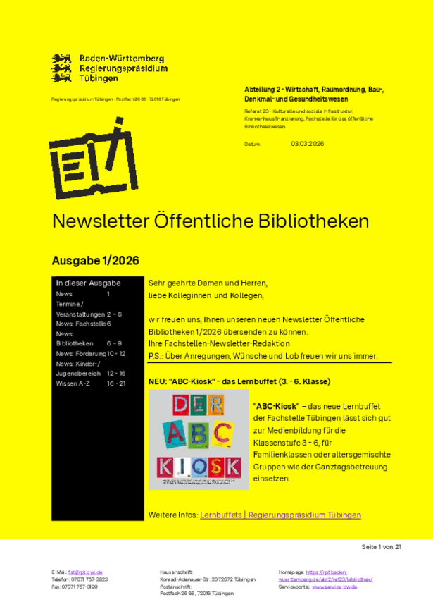 Herausgegeben vom Regierungspräsidium Tübingen - Fachstelle für das öffentliche Bibliothekswesen.