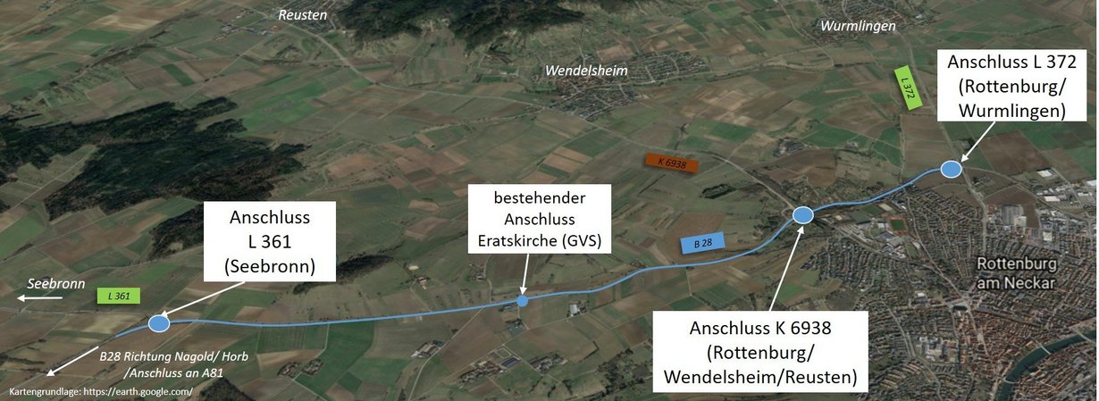 Im Zuge der B 28 sind an dem Anschluss der L 361 bei Seebronn und dem Anschluss der K 6938 nördlich von Rottenburg am Neckar Verbesserungen erforderlich. Ziel der Planungen des Regierungspräsidiums Tübingen ist es, den Verkehrsfluss zu verbessern, sowie die Verkehrskapazität und die Verkehrssicherheit zu erhöhen.