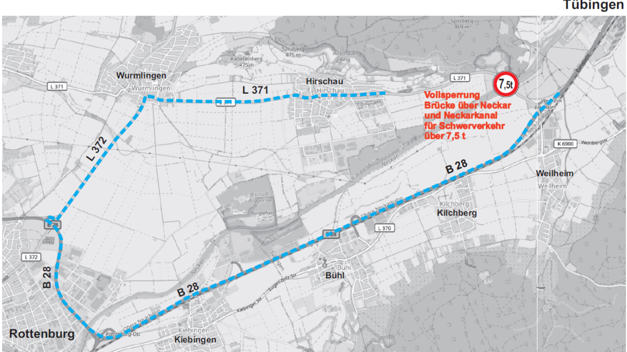Die Brücke zwischen Tübingen und Hirschau über den Neckar und Neckarkanal im Zuge der L 371 weist bauliche Mängel auf. Anlässlich einer Bauwerksprüfung wurde festgestellt, dass aus wirtschaftlicher Sicht ein Ersatzneubau mittelfristig notwendig wird.