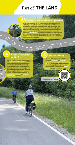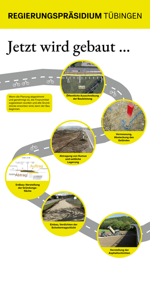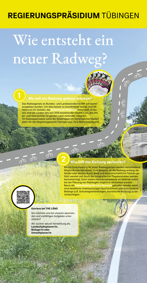Vom neu aufgestellten Bedarfsplan Radwege des Landes Baden-Württemberg über die Entscheidung für den konkreten Trassenverlauf des Radwegs und die Berücksichtigung von Natur und Umwelt bis hin zum Bau: Für die Ausstellung des Regierungspräsidiums Tübingen an der Gartenschau in Balingen 2023 haben wir dies an einer Plakatsäule anschaulich für Sie zusammengestellt.