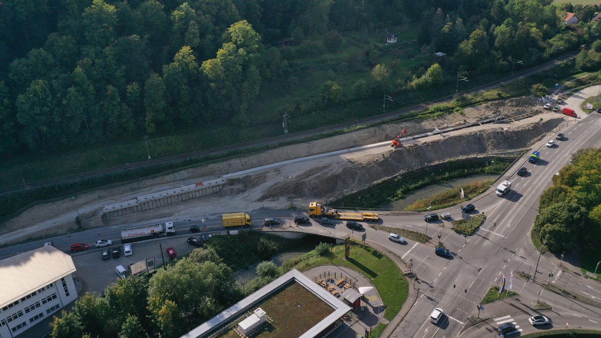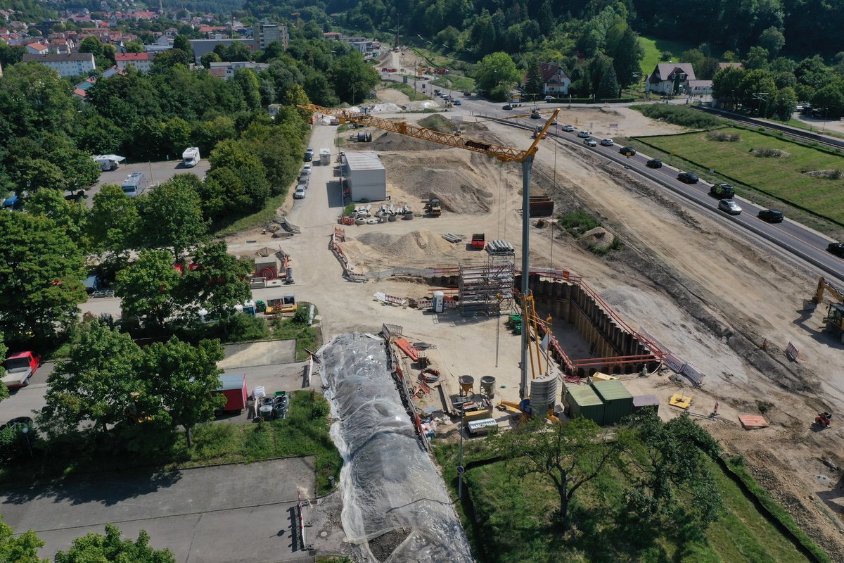 Am Wasserfallknoten wird die nördliche Fahrbahn der neuen B 28 hergestellt. Am Hochhausknoten laufen die Arbeiten zur Herstellung der Stützwand zwischen Bahn und der neuen B 28.