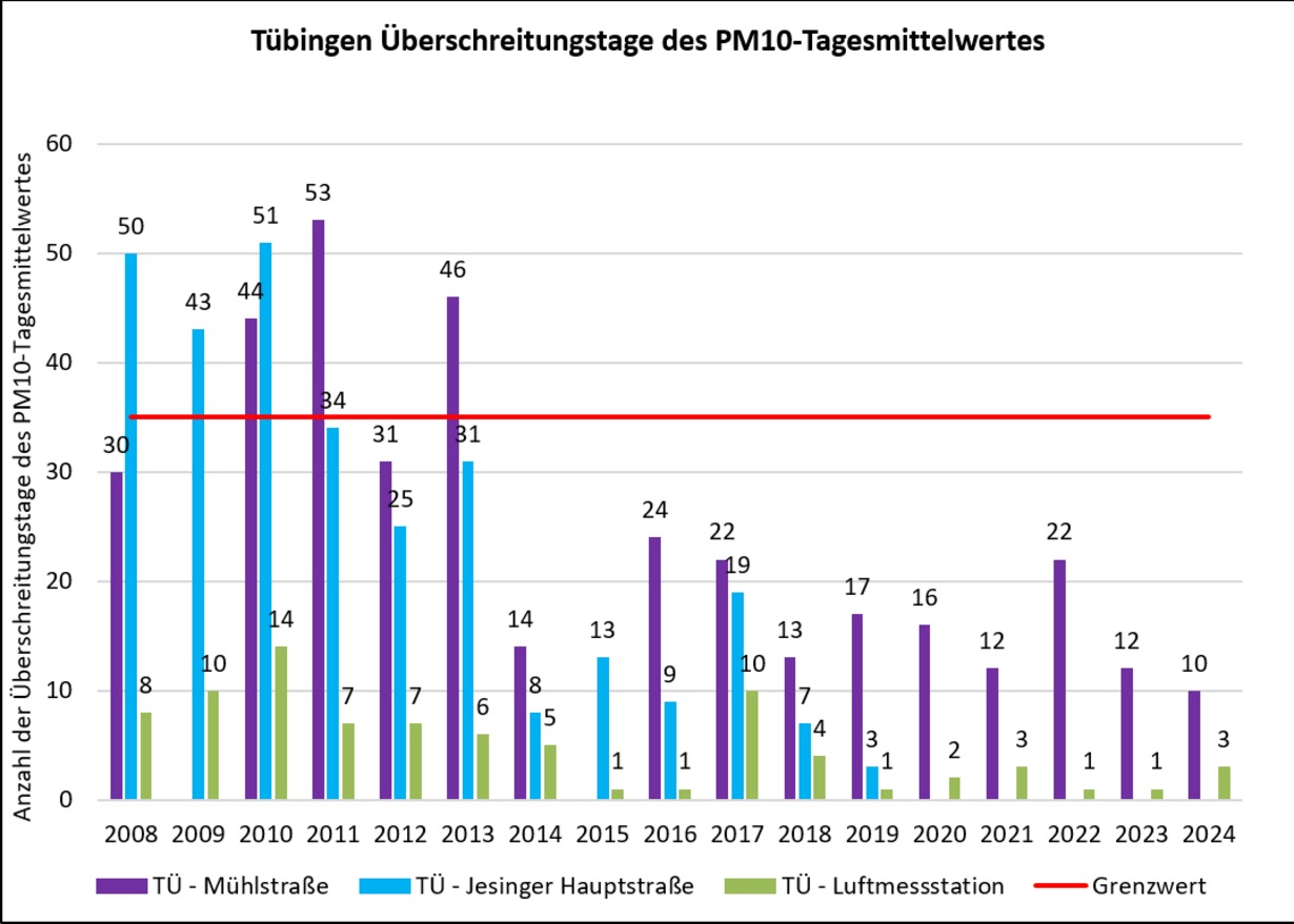 Die Luftqualität im Regierungsbezirk Tübingen hat sich aufgrund der durch Land und Städte ergriffenen wirksamen Maßnahmen weiter verbessert. Auch die an der verkehrsnahen Messstation Tübingen Mühlstraße gemessenen Immissionskonzentrationen von Stickstoffdioxid und Feinstaub liegen deutlich unterhalb der aktuell geltenden Grenzwerte. Das Regierungspräsidium Tübingen hat daher den Luftreinhalteplan für Tübingen fortgeschrieben und die Umweltzone sowie Geschwindigkeitsreduzierungen aufgehoben.