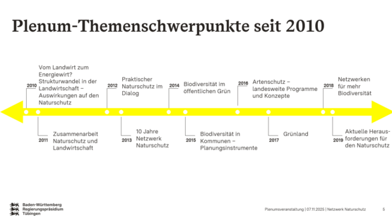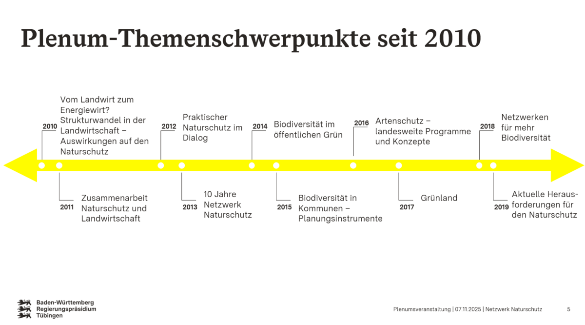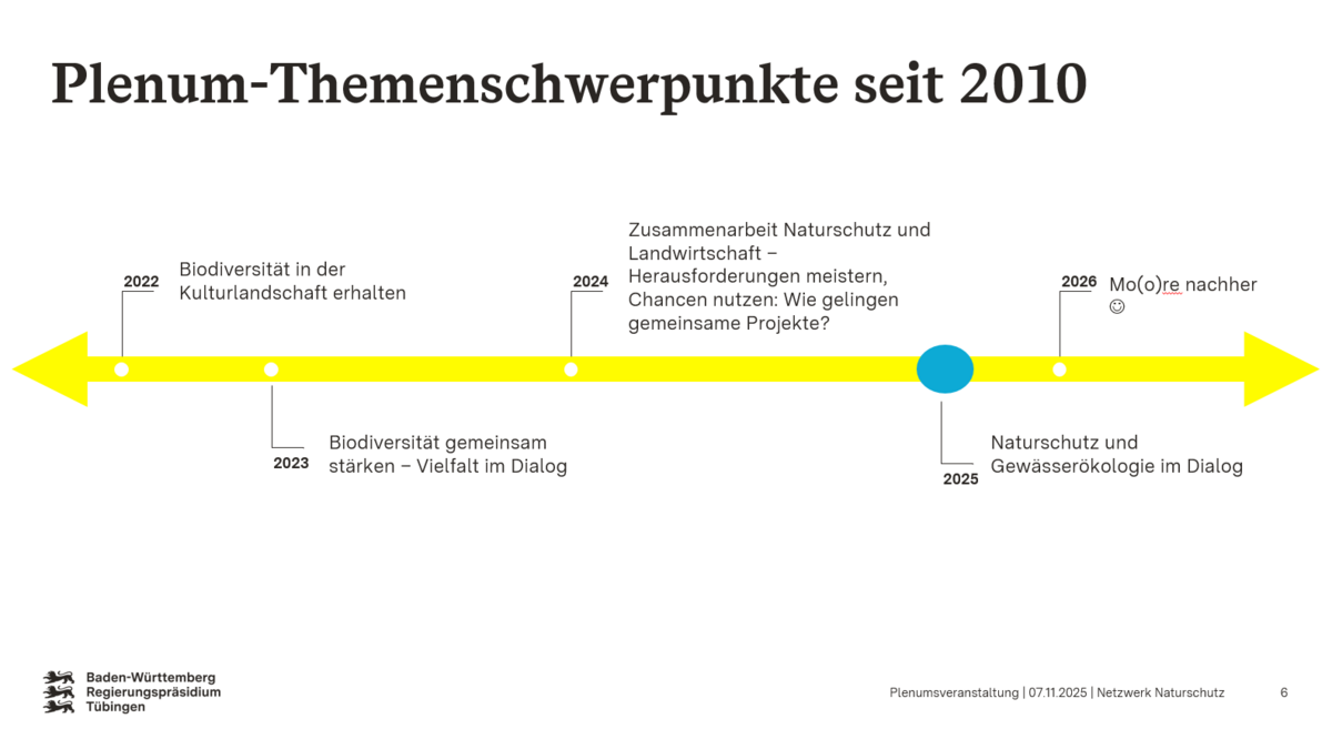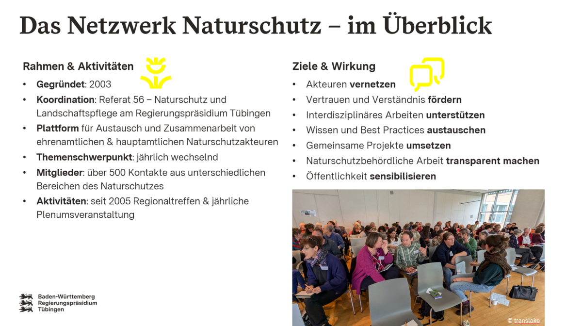 Das Netzwerk Naturschutz wird vom Referat 56 - Naturschutz und Landschaftspflege am Regierungspräsidium Tübingen koordiniert. Das Netzwerk im Regierungsbezirk Tübingen bietet eine wichtige Plattform für den Austausch und die Zusammenarbeit von ehrenamtlichen und hauptamtlichen Naturschutzakteuren. Teilnehmende des Netzwerks kommen aus unterschiedlichsten Bereichen des Naturschutzes – dazu gehören Naturschutzvereine und -verbände, die Naturschutzverwaltung sowie Kommunen. Darüber hinaus beteiligen sich engagierte Bürgerinnen und Bürger sowie Vertreterinnen und Vertreter angrenzender Bereiche wie Wasserwirtschaft, Landwirtschaft und Forstwirtschaft aktiv am Netzwerk. Seit seiner Gründung im Jahr 2004 zählt das Netzwerk bis heute mehr als 500 Teilnehmende.